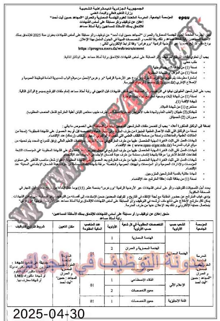 تعلن المدرسة المتعددة العلوم للهندسة المعمارية والعمران عن فتح مسابقة على أساس الشهادات بعنوان سنة 2025 للالتحاق بسلك الأساتذة المساعدين رتبة “أستاذ مساعد” كم هو مبين ادناه