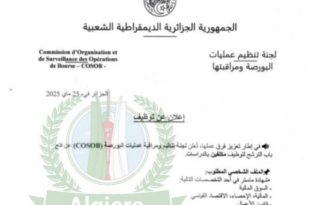 ولاية الجزائر المجلس الأعلى للغة العربية ads إعلان توظيف يعلن المجلس الأعلى للغة العربية عن فتح مسابقة توظيف على أساس الاختبارات للالتحاق بالرتب المبينة في الجدول التالي: الرتبالمناصب المفتوحةشروط الالتحاقمهندس دولة في الإعلام الآلي02– يشترط على المترشح أن يكون حائزاً على شهادة مهندس دولة أو ماستر في الإعلام الآلي أو …