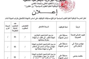 وزارة التعليم العالي والبحث العلمي المدرسة الوطنية العليا للعلوم السياسية “بن عكنون” إعلان ads تعلن المدرسة الوطنية العليا للعلوم السياسية عن فتح مسابقات التوظيف للالتحاق على أساس الشهادة للرتب المبينة أدناه: الرتبةنمط التوظيفشروط الالتحاقالتخصص المطلوبعدد المناصب المفتوحةشروط مالية أخرىطبيب عام في الصحة العموميةمسابقة على أساس الشهادةمن بين المترشحين الحائزين شهادة …