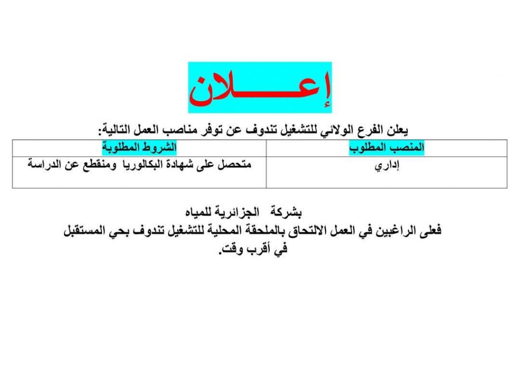 - اعلان توظيف في مؤسسة الجزائرية للمياه ADE