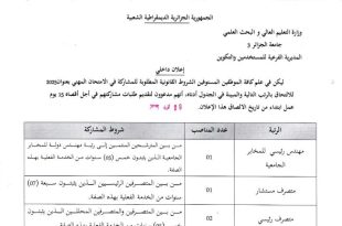 وزارة التعليم العالي و البحث العلمي ads جامعة سعيدة د. مولاي الطاهر إعلان عن توظيف و / أو مسابقة على أساس الشهادات للالتحاق برتبة أستاذ مساعد قسم تعلن جامعة سعيدة د. مولاي الطاهر عن فتح توظيف و / أو مسابقة على أساس الشهادات للالتحاق برتبة أستاذ مساعد قسم “ب”، رتبة …