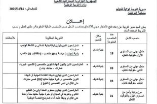 وزارة العمل والتشغيل والضمان الاجتماعي الوكالة الوطنية للتشغيل الفرع الولائي للتشغيل ورقلة ads عرض عمل توزيع عروض العمل المسجلة لدى الفرع الولائي للتشغيل بورقلة على الملاحق المحلية للتشغيل ورقلة في: 2025/04/28 المؤسسةالديوان الوطني للسقي ONIDالمنصب المطلوبعامل عاديالعدد المطلوب04 يلزم رؤساء الملاحق المحلية باحترام الآجال القانونية وعدد المترشحين مسابقات توظيف بمديرية …